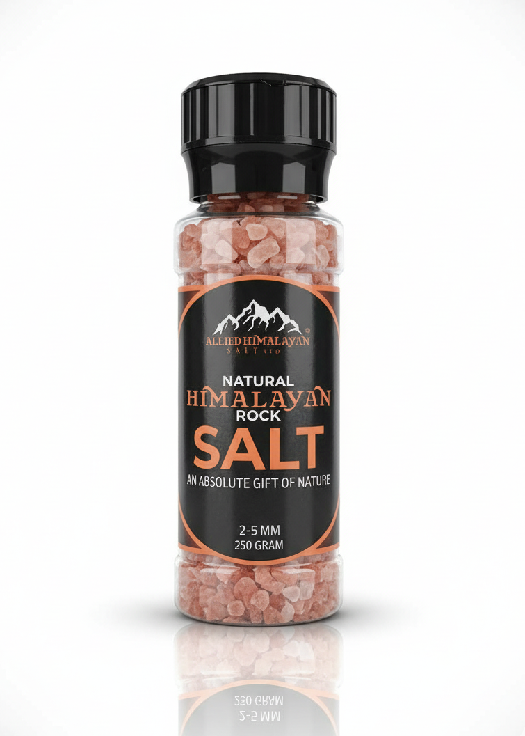 A 250g PET shaker containing 2–5mm coarse Himalayan Pink Salt crystals perfect for grilled meats, seafood, and flavour-packed recipes. Ideal for chef-style cooking in the UK. Strong, durable packaging ensures freshness and easy pouring.