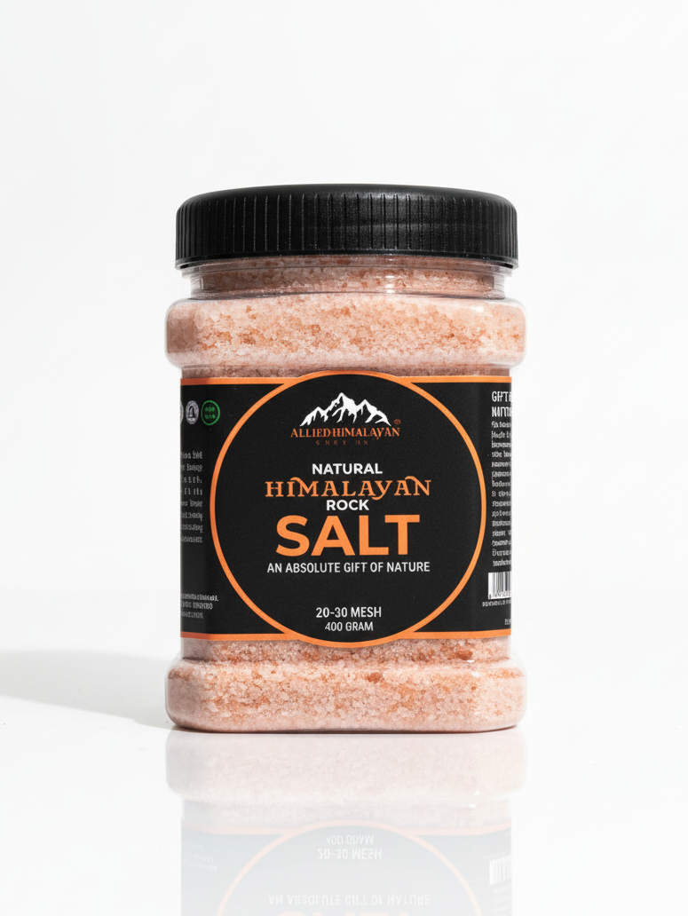 A reusable 400g jar filled with fresh Himalayan Pink Salt.