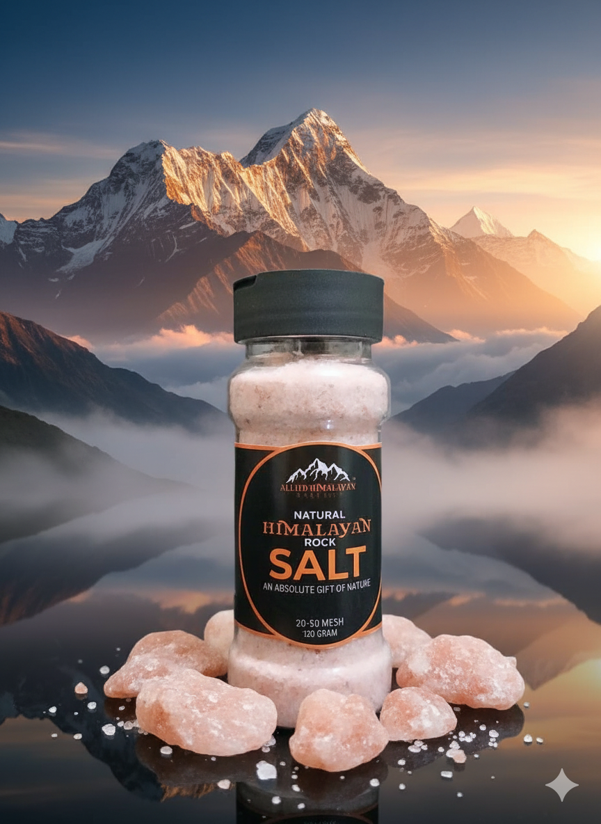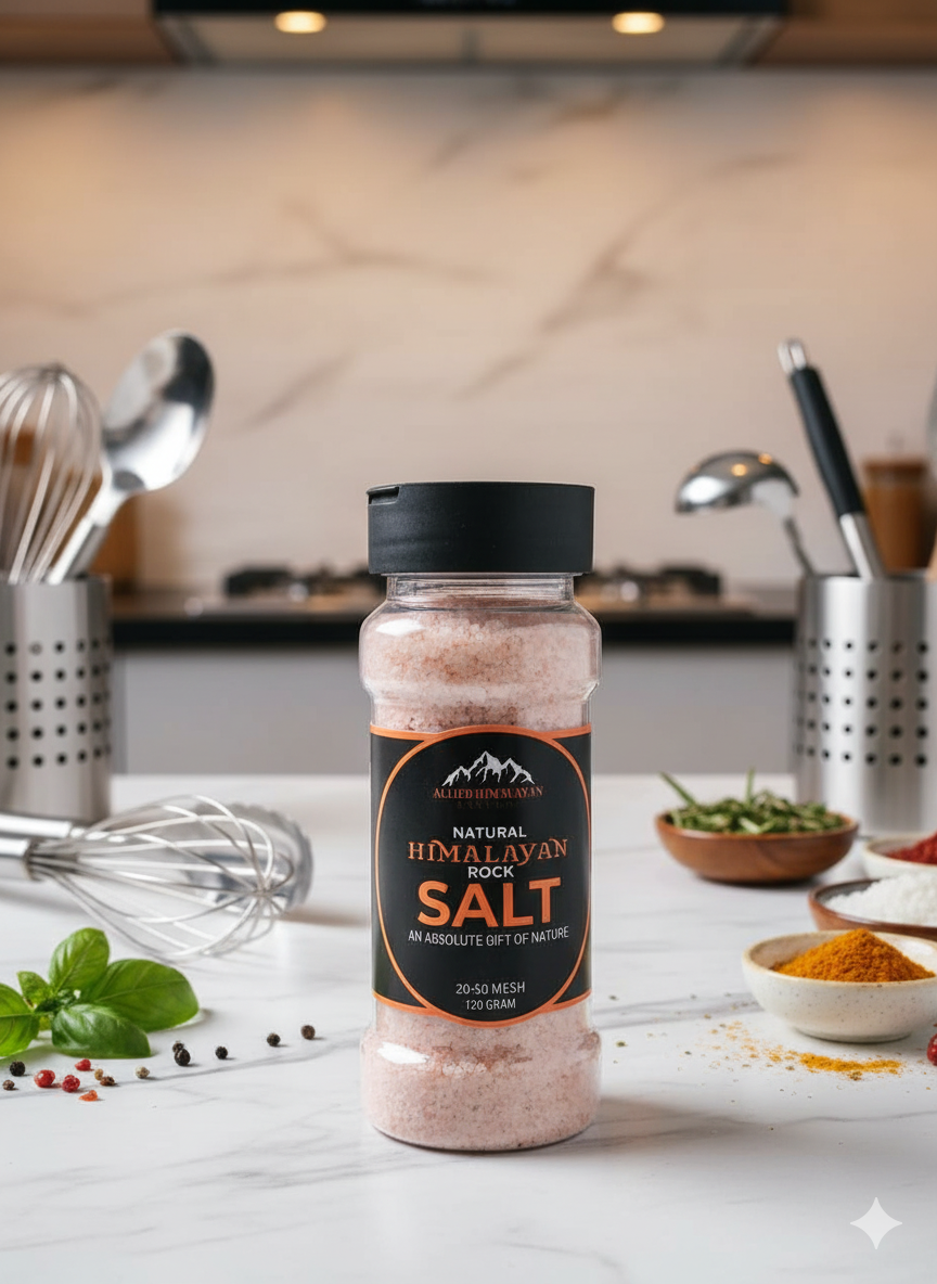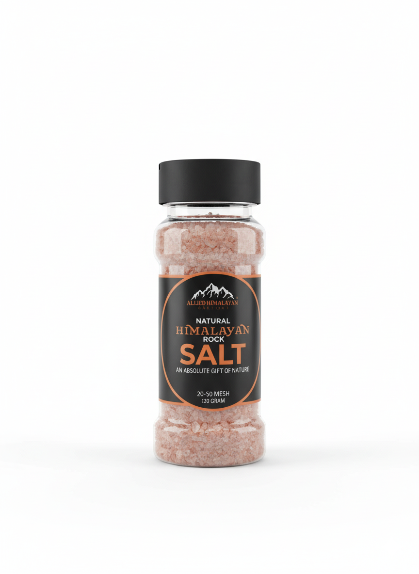 A premium 120g PET shaker filled with 100% natural Himalayan Pink Salt, sourced directly from the foothills of Pakistan. Perfect for daily cooking, seasoning, eggs, vegetables, curries, soups, and salads.